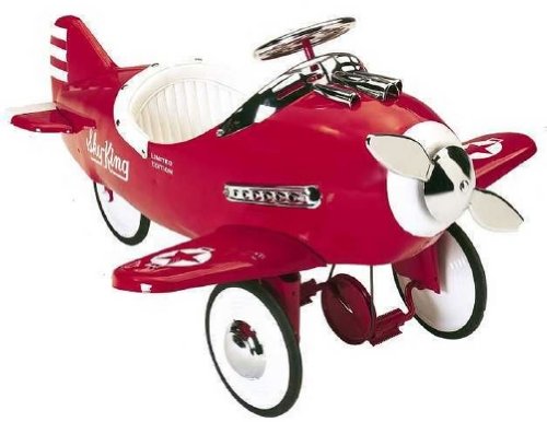 Imagination Flies High in our Retro-Style Pedal Planes Styledfrom the classic originals, these beautiful pedal planes will spark theimagination of any junior pilot or adult collector. The planes are madefrom heavy-guage stamped steel and sport a high gloss powder-coatfinish; they are finished off with attractive decorations, chromedetails and a leather-like padded seat. The pedals will move the planeforward and back while spinning the propeller; and the tearing wheelturns the airplane using the rear wheel -- just like the real thing!Fashioned afterour nostalgic Silver Pursuit Plane, the Sky King comes with a custompadded seat, bright red powder coat and shiny chrome detailing. Likeall our planes it has a moving spring-loaded propeller, sealed ballbearing drive, non-slip pedals and high-traction tires. It is finishedin a long-lasting lead-free powder coat and adorned withoriginal-vintage graphics. Built for the typical youngster ages 2 to 5years old. Specifications Dimensions - Height (Inches) 26 Dimensions - Length (Inches) 45 Dimensions - Width (Inches) 35 Gross Weight (lbs.) 33 Shipping Carton Dimensions - Height (Inches) 16 Shipping Carton Dimensions - Length (Inches) 48 Shipping Carton Dimensions - Width (Inches) 21 Shipping Carton Gross Weight (lbs.) 46 Finish Lead Free Powder Coat Paint w/Decals